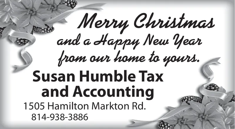 Merry Christmas and a Happy New Year from our home to yours. Susan Humble Tax and Accounting 1505 Hamilton Markton Rd. 814-938-3886 Merry Christmas and a Happy New Year from our home to yours. Susan Humble Tax and Accounting 1505 Hamilton Markton Rd. 814-938-3886