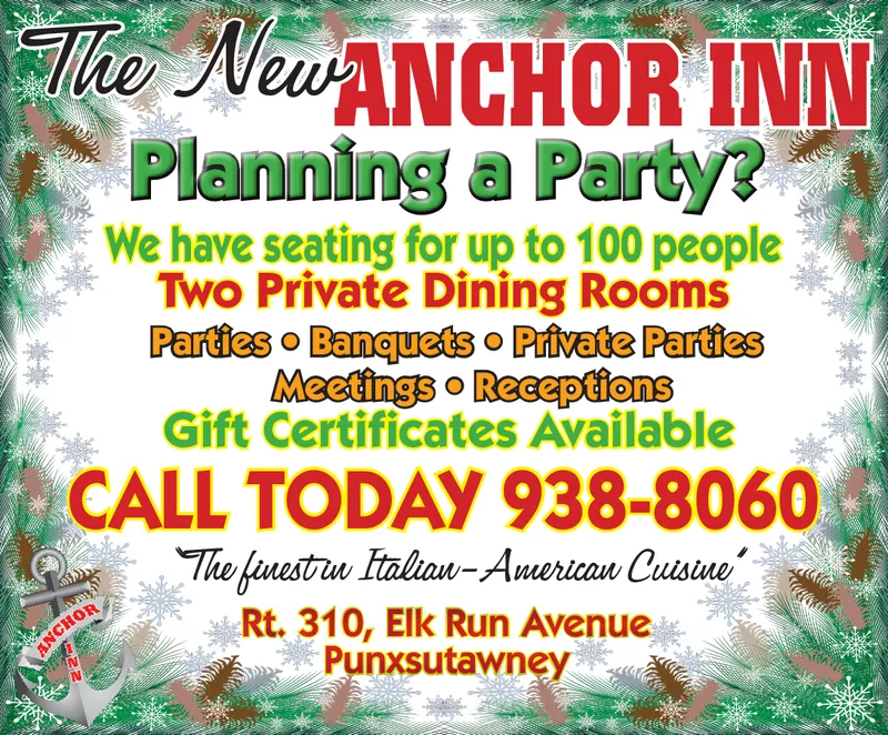 The NewANCHOR INN Planning a Party? We have seating for up to 100 people Two Private Dining Rooms Parties o Banquets o Private Parties Meetings o Receptions Gift Certificates Available CALL TODAY 938-8060 The fenestru Italiaw-Americau Cuisine Rt. 310, Elk Run Avenue Punxsutawney ANCHOR The NewANCHOR INN Planning a Party? We have seating for up to 100 people Two Private Dining Rooms Parties o Banquets o Private Parties Meetings o Receptions Gift Certificates Available CALL TODAY 938-8060 The fenestru Italiaw-Americau Cuisine Rt. 310, Elk Run Avenue Punxsutawney ANCHOR